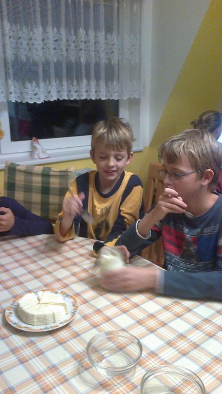 Děti při volném povídání získali informace jak taková farma vypadá, kolik mají kraviček, co všechno vyrábějí, apod. Paní Menšíková dětem donesla ochutnat jogurt, přírodní sýr, tvaroh, mléko. Společně jsme si vyrobili pak máslo ze smetany. Děti si ho naplnily do formiček a druhý den ráno měly výbornou snídani.