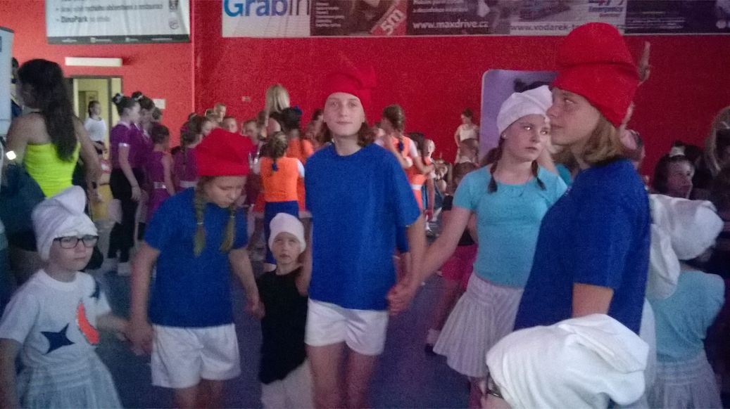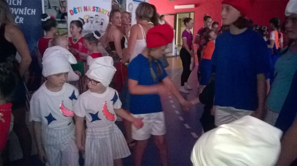 Bylo to příjemné osvěžení. Po osprchování nás pak čekala výborná večeře, kterou si děti samy vybraly -smažený sýr a hranolky. Jako tečka krásného dne byl pobyt na hřišti – trampolína, pískoviště, karty, volejbal. Prostě paráda. Po všech těchto aktivitách děti usnuly, jako by je do vody hodil. V autocampu Kotva, kde již jezdíme nějakou dobu se o nás postarali i ráno a připravili nám výbornou snídani. Děti moc hezky poděkovaly a rozloučili jsme se. Potom jsme jeli opět do Arény Sparta, kde pokračoval druhý den závodů. Zrovna skončila gymnastika a byla zahájena soutěž v tanci, proto rychle, rychle do kostýmů a na závodní plochu. I v této kategorii se děti líbily a s oceněním byly spokojené.