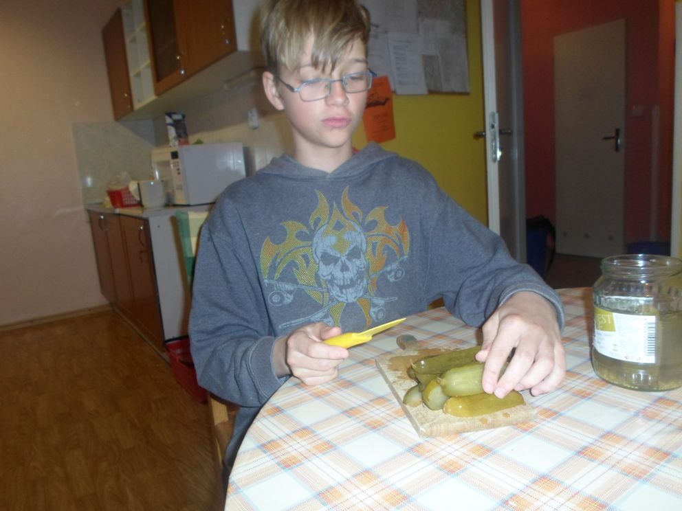 Hned ráno se kluci vydali se seznamem v ruce na nákup do TESCA. „ Když si nebudete vědět rady, zeptejte se paní prodavačky. Neztraťte paragon.“ Volala teta za námi. Šli jsme totiž poprvé nakupovat maso, proto nám teta hezky radila a přiznala, že má malé obavy. My jsme ji ale překvapili a donesli nákup úplně pořádku. Dostali jsme velkou pochvalu. Zapečené těstoviny nás moc lákaly, tak chtěli vařit úplně všichni. Uvařit těstoviny, orestovat nakrájené masíčko a cibulku, vše rozložit na pekáč, přidat hrášek a zalít rozšlehaným vejcem. Hurá vše bylo hotovo a teď jsme jen sledovali přes okýnko, co se děje.