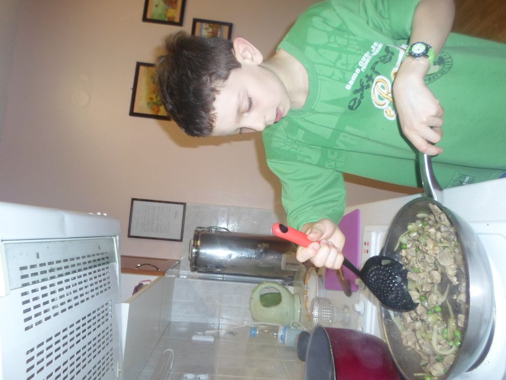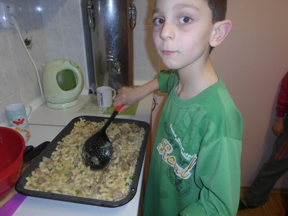 U nás na čtyřce máme velké jedlíky. Není vůbec divu, neboť čtyři kluci a dvě děvčata jsou stále v pohybu. Hrají fotbal, kde se dá a neposedí ani chvilku. To jim pak samozřejmě vytráví. Máme rádi víkendy, protože si vaříme sami večeře a moc nám chutná. V týdnu se s námi teta poradí a vybere nějaké jednoduché jídlo. Tuhle to byly zapečené těstoviny s masem.