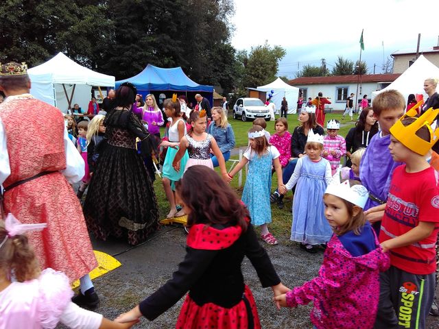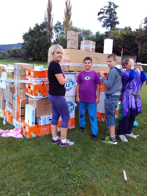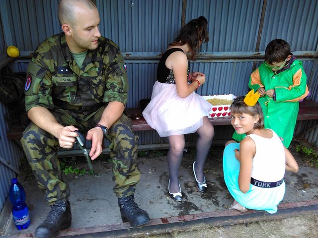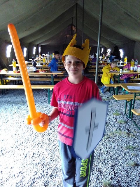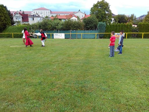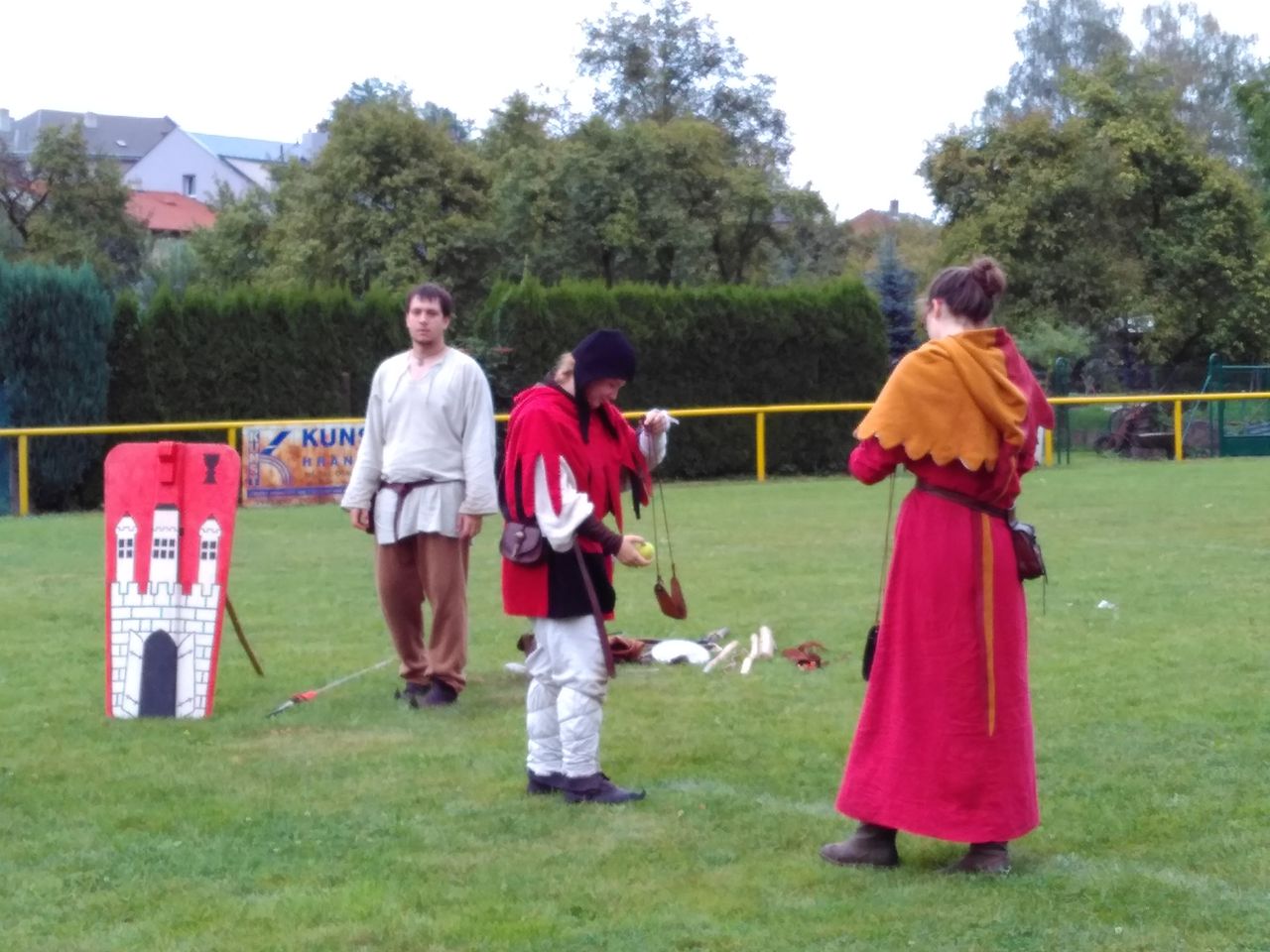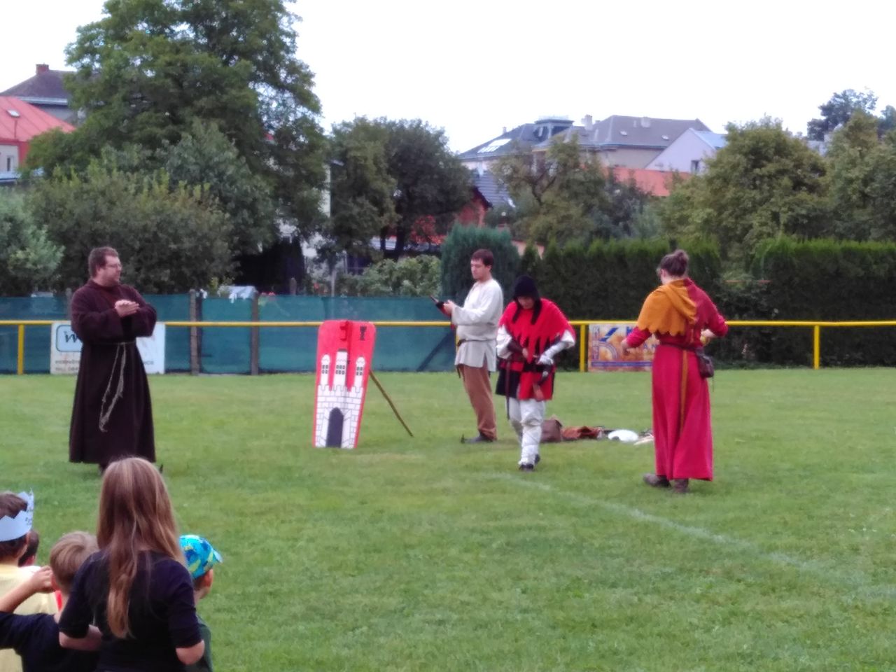 Po obědě skupinka osmi nejmladších dětí s tetou vyráží směr „zábava“. Náležitě vybaveni vlastnoručně vyrobenou královskou korunou a rytířským štítem, což byl náš úkol od pořadatelů, přijíždíme do areálu fotbalového hřiště v Hranicích. Jsme srdečně vítáni a necháváme se zcela přirozeně vtáhnout do hry. Vyplňujeme tajenku, která po nás chce informace z doby, kdy vládl Jan Lucemburský a Karel IV. Ve většině otázek pálíme rychlou odpověď, tam, kde jsme zaskočeni, nám pomáhají nápovědy pořadatelů. Super, první hra je za námi, a děti jsou za svou snahu odměněny malým dárkem. Následuje krátké občerstvení a už nás díky svým praktickým ukázkám do historie láká i soubor, který se zabývá historickými zbraněmi. Ještě ani pořádně nedozněla poslední salva z děla a už se zapojujeme do stavby hradu z krabic – zde zcela vyniká zkušený stavbyvedoucí Mário. Po vybudování hradu následují další a další zastávky, které jsou tematicky zaměřené na středověk – dílna ručního papíru, skriptorium – dobová tiskárna, psaní dobovými pery, starodávný jarmark.