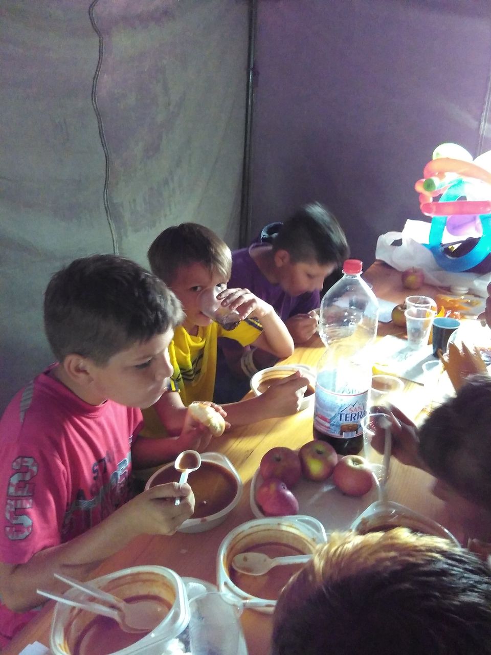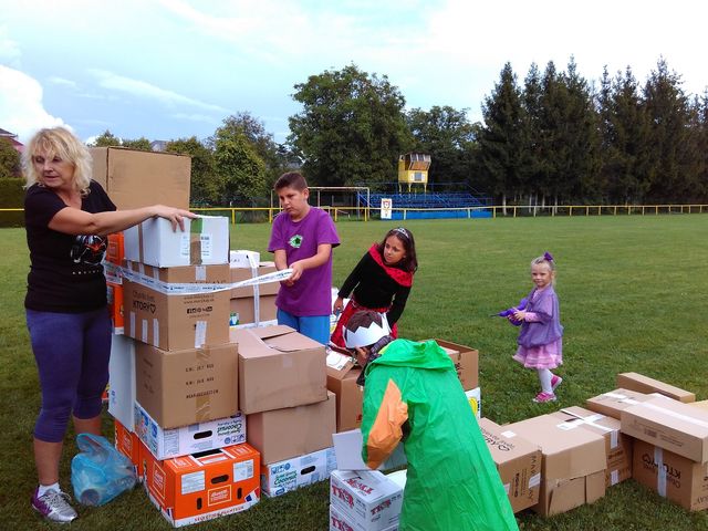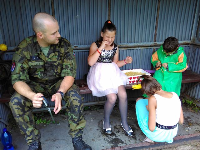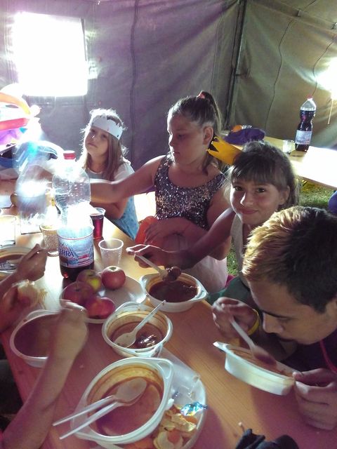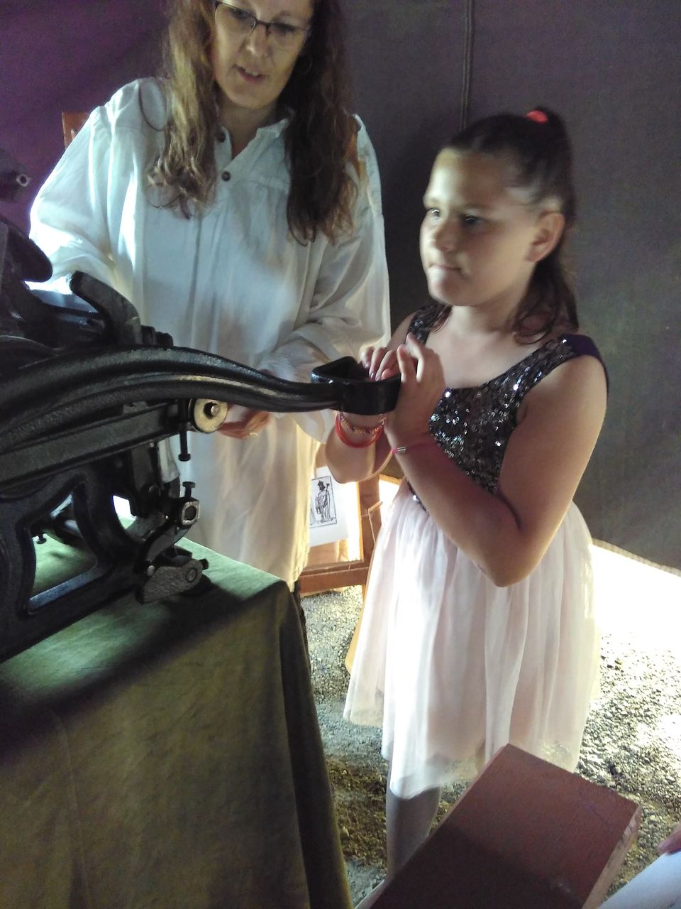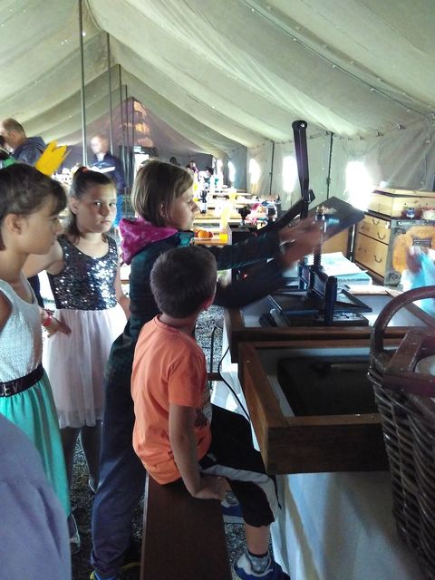 Po obědě skupinka osmi nejmladších dětí s tetou vyráží směr „zábava“. Náležitě vybaveni vlastnoručně vyrobenou královskou korunou a rytířským štítem, což byl náš úkol od pořadatelů, přijíždíme do areálu fotbalového hřiště v Hranicích. Jsme srdečně vítáni a necháváme se zcela přirozeně vtáhnout do hry. Vyplňujeme tajenku, která po nás chce informace z doby, kdy vládl Jan Lucemburský a Karel IV. Ve většině otázek pálíme rychlou odpověď, tam, kde jsme zaskočeni, nám pomáhají nápovědy pořadatelů. Super, první hra je za námi, a děti jsou za svou snahu odměněny malým dárkem. Následuje krátké občerstvení a už nás díky svým praktickým ukázkám do historie láká i soubor, který se zabývá historickými zbraněmi. Ještě ani pořádně nedozněla poslední salva z děla a už se zapojujeme do stavby hradu z krabic – zde zcela vyniká zkušený stavbyvedoucí Mário. Po vybudování hradu následují další a další zastávky, které jsou tematicky zaměřené na středověk – dílna ručního papíru, skriptorium – dobová tiskárna, psaní dobovými pery, starodávný jarmark.