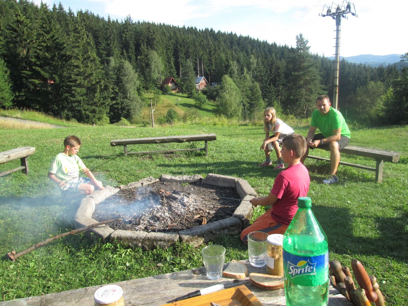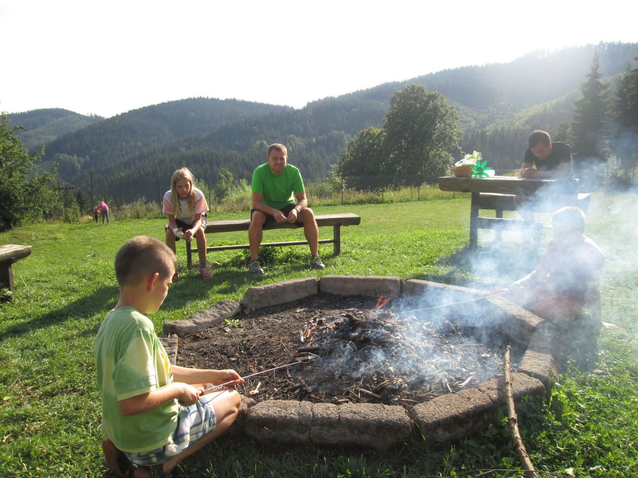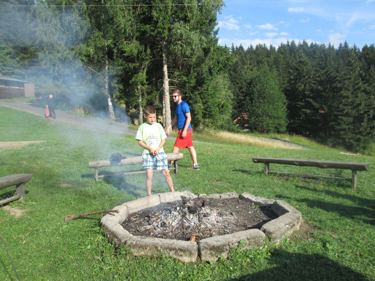 Ke konci pobytu se počasí již umoudřilo a my se vydali do Karolinky prohlédnout si Muzeum sklářství, které reprezentuje slávu tamních sklářů. V expozici jsme se dozvěděli o historii sklářství nejen v Karolince, ale také na Valašsku a Moravě. O podnikatelské rodině Reichů, která huť v dnešní Karolince založila a jejichž výrobky se vyvážely téměř do celého světa. Prohlédli si unikátní sklo a sklářské výrobky, např. malovanou soupravu na pivo z roku 1862, broušené soupravy ze stejného období. Také sklářské nářadí a oblečení z doby minulé. V malém projekčním sálu jsme zase viděli postup zhotovování sklářských výrobků. V prodejně skla jsme si mohli koupit zajímavé tvary skleniček. Odměnou za pěší túru a hezké chování byl zmrzlinový kornout zakoupený tetou Majkou. Poslední den jsme si odpoledne zpříjemnili sbíráním klestí v lese a pak opékáním párků. Večer se už uklízelo všechno sportovního náčiní, hry a další věci. S balením pomáhaly téměř všechny děti. Osobní věci pak děti do kufrů spíše naházely, než sbalily, hotovo měly raz dva. Jídlo dětem opět chutnalo. Ráno se rozhodovaly mezi salámem, šunkou a šunkovým salámem, braly si sýry a hodně zeleniny, mohly si vzít marmeládu nebo med, často si dávaly lupínky s mlékem. Skvělé byly pomazánky. Obědy a teplé večeře byly výborné.