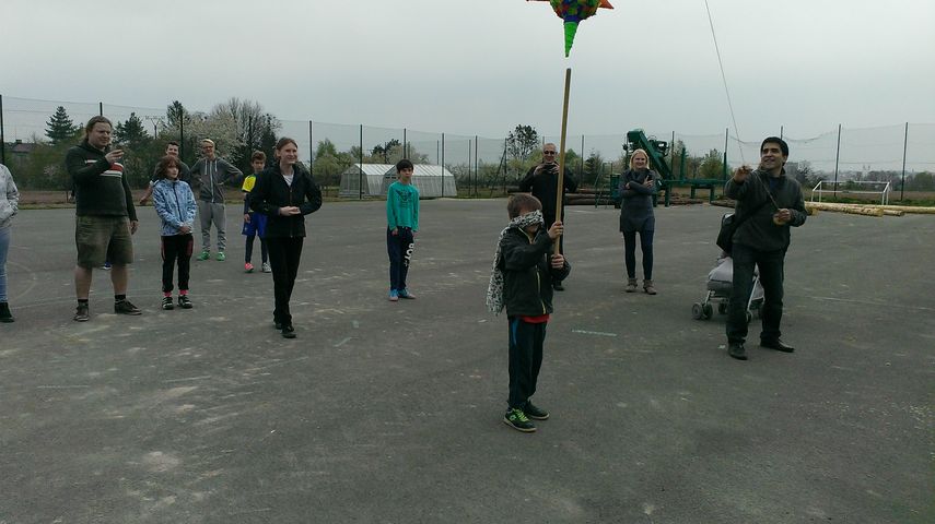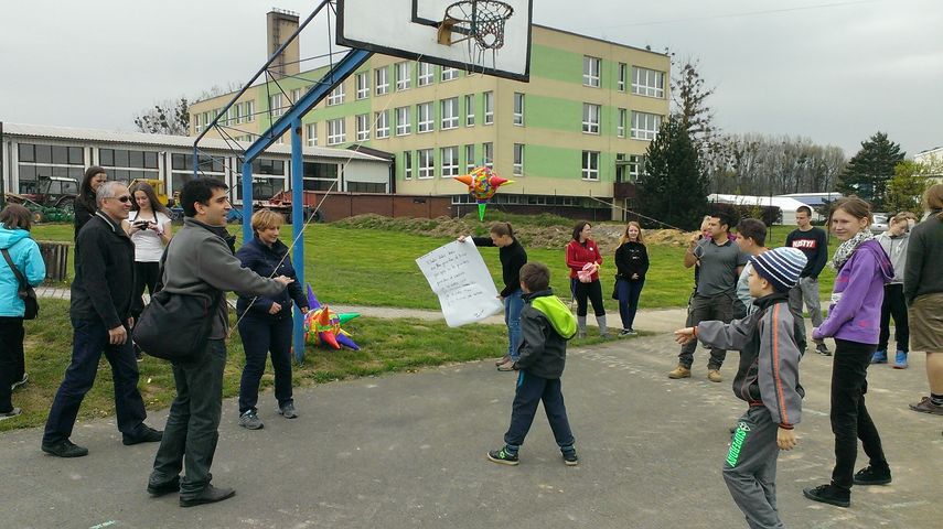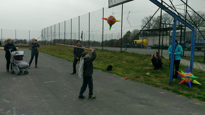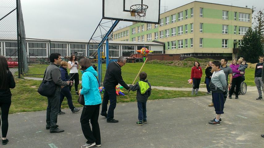 Dozvěděli jsme se jednak zeměpisná fakta, ale také spoustu zajímavostí o této zemi. Naše otázky nám zodpovídali dva pánové, kteří pocházejí přímo z Mexika. Byli velmi přátelští a ochotní. Všechny děti nejvíce zaujala mexická tradice rozbíjení Piňaty. Jedná se o pověšenou papírovou kouli naplněnou sladkostí. Děti se postupně střídaly a se zavázanýma očima se ji snažili rozbít dřevěnou holí, aby se dostaly ke sladkostem. Po dlouhém úsilí se nám povedlo zdolat všechny tři Piňaty. Poté si děti povídaly s dobrovolníky nebo si zahrály fotbal. Počasí nám přálo a akce se moc líbila. Děkujeme.