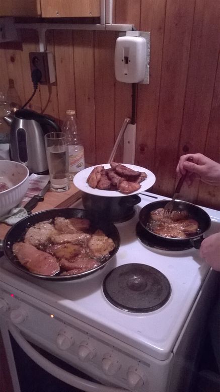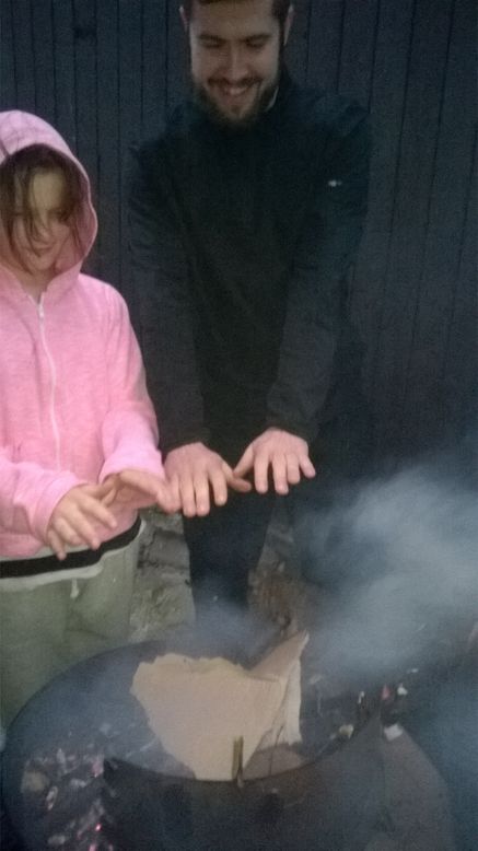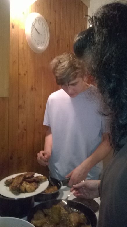 I přes nepřízeň počasí se Matěj nechtěl vzdát grilování venku. Všichni se snažili pomoci a sbírali co nejsušší dříví. Dokonce Jirka s Nikolkou se rozhodli jít požádat o suché dříví, ale nepochodili. Matěj se nevzdával a zkoušel a zkoušel. Po nějaké době se však svého cíle musel vzdát a grilovali jsme masíčko na pánvičce na sporáku. Přesto však je potřeba pochválit, nebo vše si sám připravoval, kořenil a ugriloval.