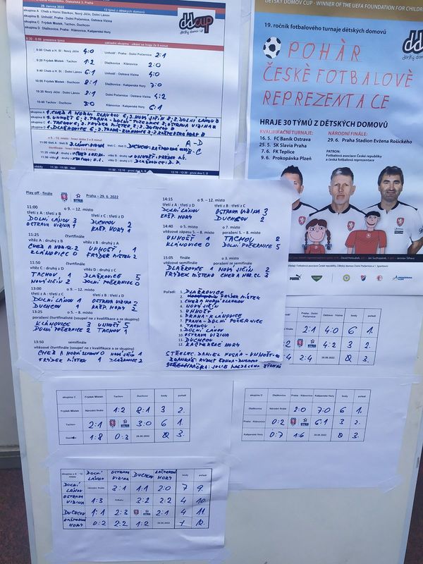 V turnaji se děti snažily seč mohly a bylo to vidět na výsledcích, kdy jsme se probojovali potřetí v řadě do finále turnaje. Během turnaje jsme poráželi týmy, jako Duchcov, Cheb a Horní Slavkov nebo Unhošť. Ve finálovém utkání se štěstěna od nás lehce odvrátila, zahazovali jsme šance a soupeř z Dlažkovic z ojedinělé střely přesně udeřil. Zlatý hattrick se nám tedy nepodařilo získat, ale turnaj pro nás skončil opět fantastickým výsledkem a ziskem druhého místa v republice, aneb co by za to jiné týmy, které tam pravidelně jezdí daly. Klukům patří velké poděkování za předvedené výkony, naslouchání pokynů během utkání a chování během celého výletu do Prahy. Velký dík patří také pořadatelskému týmu z Dolních Počernic a zástupcům z FAČR, kteří nám mimo jiné zajistili krásné ubytování v hotelu. Tak zase za rok, DD cupe!